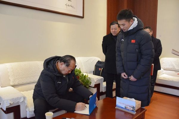 副市长刘兵、市教育局局长曹祖臣、市体育局局长于志杰会见了许海峰并与之座谈,介绍了我市经济社会发展的基本情况以及深化体教融合促进青少年健康成长全面发展工作情况。