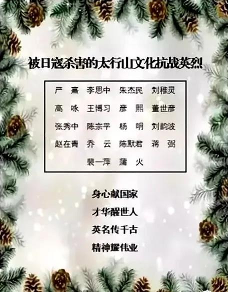 在太行山抗战中,文化艺术届牺牲的英烈(调查统计尚不完全)。选自“下北彰抗战文化历史及相关大事记”