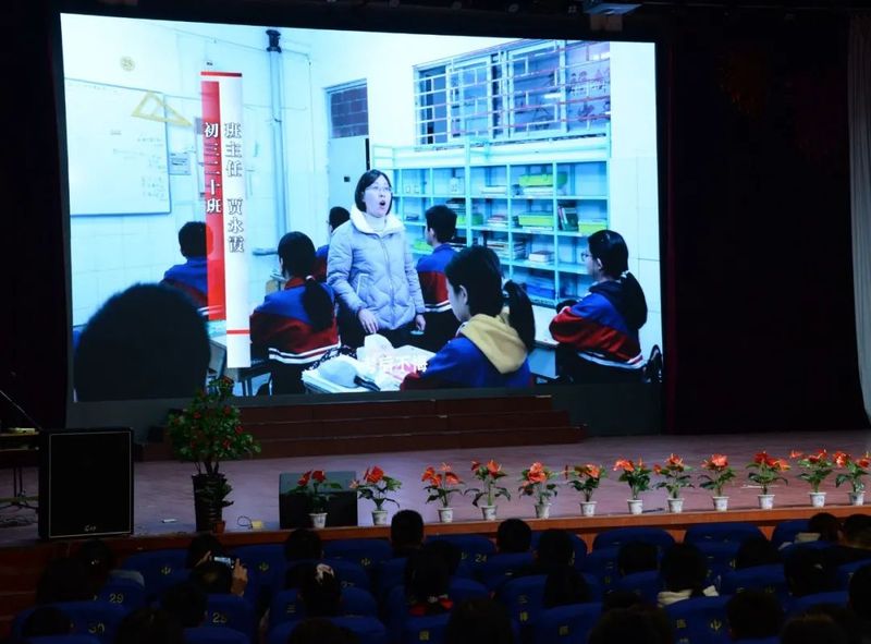 大会上,初中部全体班主任荟萃一堂,欣赏了同学们悉心准备的节目。合唱《飞来的花瓣》、舞蹈诵读《春暖花开》以及情景手势舞《夜空中最亮的星》为班主任老师们带来了一场精美的视听盛宴,洗去了他们一天的疲惫,表达了学生们对老师的敬意和爱戴。