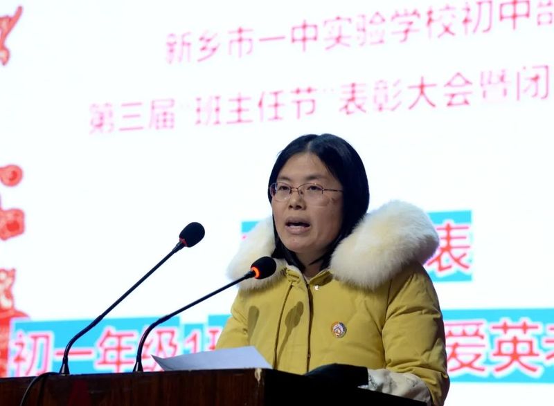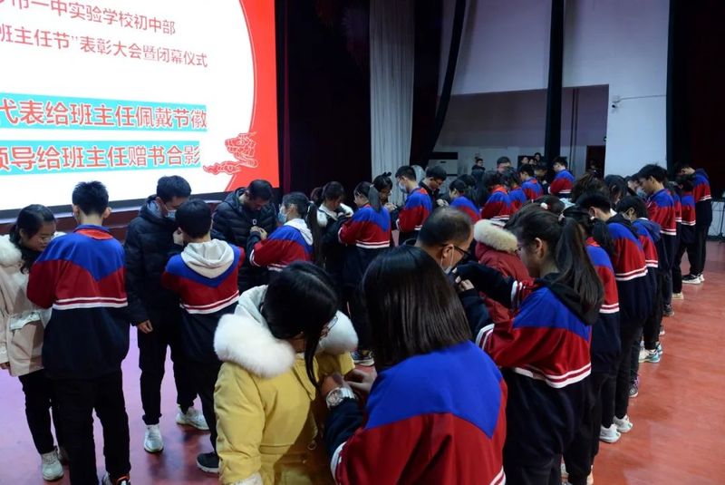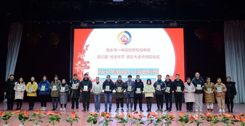 班主任代表在会上发言,介绍了自己的班主任心路历程,河南省优秀班主任、我校教师于永新作带班经验交流,分享了自己的班主任工作经历、收获与感悟。同学们为老师们佩戴节徽,并鞠躬致敬。