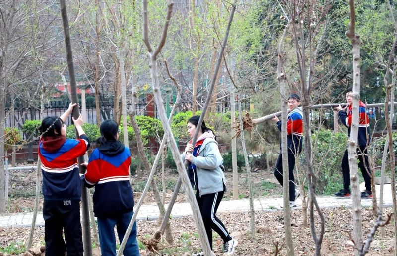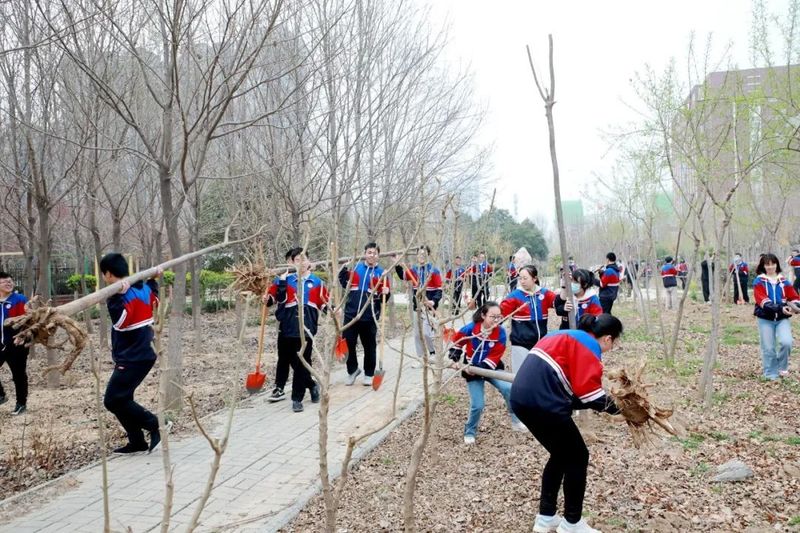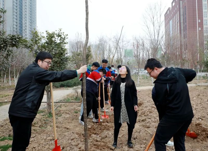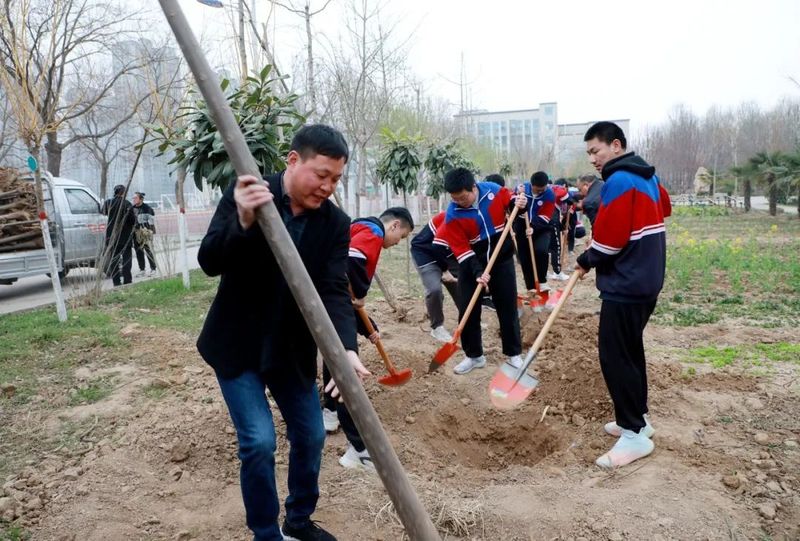 植树现场,师生们三五人一组,互相配合,干劲十足。挥锹挖坑、扶苗培土……经过辛勤劳动,一棵棵树苗在大家的忙碌下扎根一中,焕发出了无限生机。