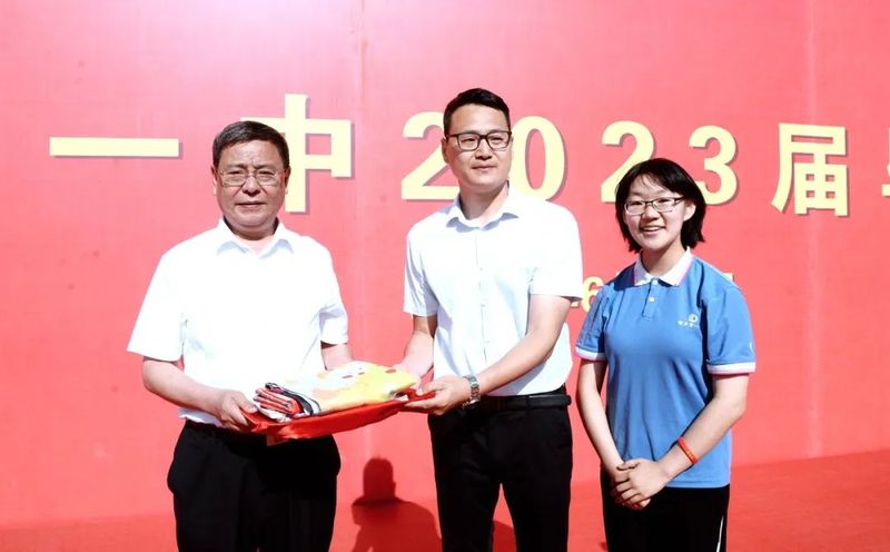 毕业之际,毕业年级把年级旗、班旗、毕业纪念册、复习资料等捐献给母校,留作永久的一中记忆。