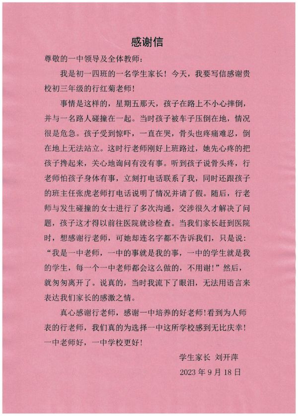 两天前,一中南校区收到一封学生家长送来的感谢信,讲述了一个这样的故事:上周五,初一年级的一名学生在上学路上和行人发生碰撞,摔倒后受伤,上班路过的行红菊老师发现后,即刻停车跑到学生身边,帮学生妥善处理了一系列问题,直至家长赶到,行老师才匆匆赶往学校。当家长真诚表达谢意并一再询问姓名的时候,行红菊老师只是头也不回地留下一句:“我是一中老师,一中的事就是我的事,一中的学生就是我的学生,应该做的,不用谢 !”事后,家长根据当时联系的电话找到了她,再三表示要登门感谢,行老师一一委婉谢绝,再次表明自己只是做了一名一中教师都会做的事情,不必放在心上。