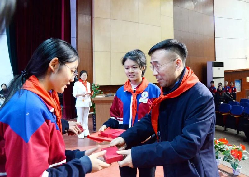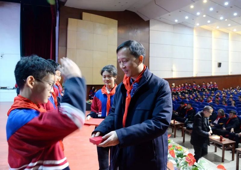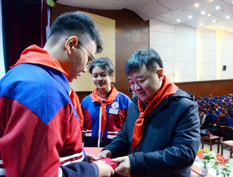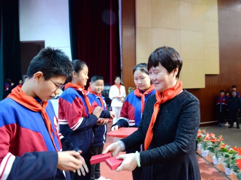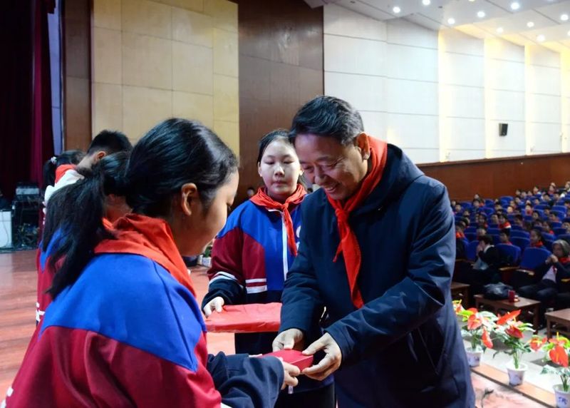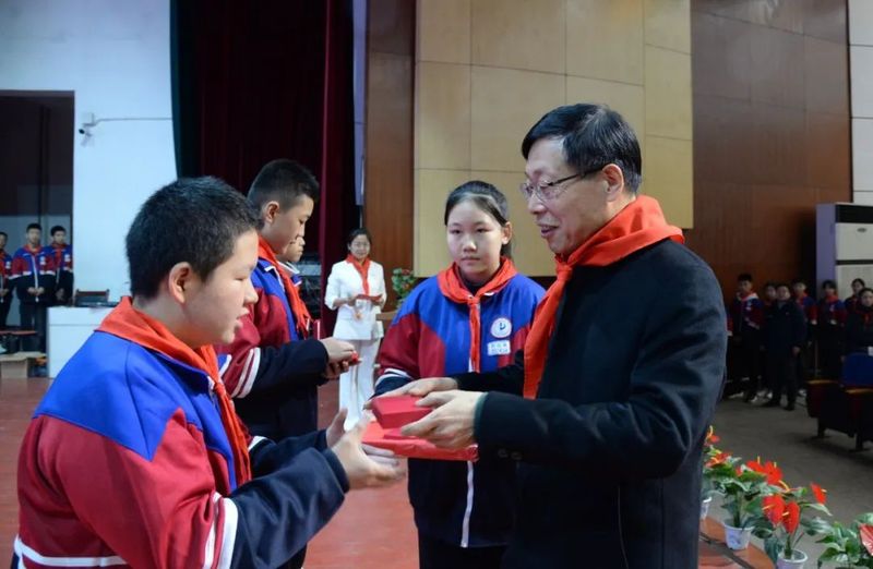 “吴老师,您好,这是我设计的雷锋奖章,敬送给您。”“雷锋式好少年”奖章设计者初二14班白一墨同学热情为领导嘉宾讲解奖章的设计理念,并敬献奖章。