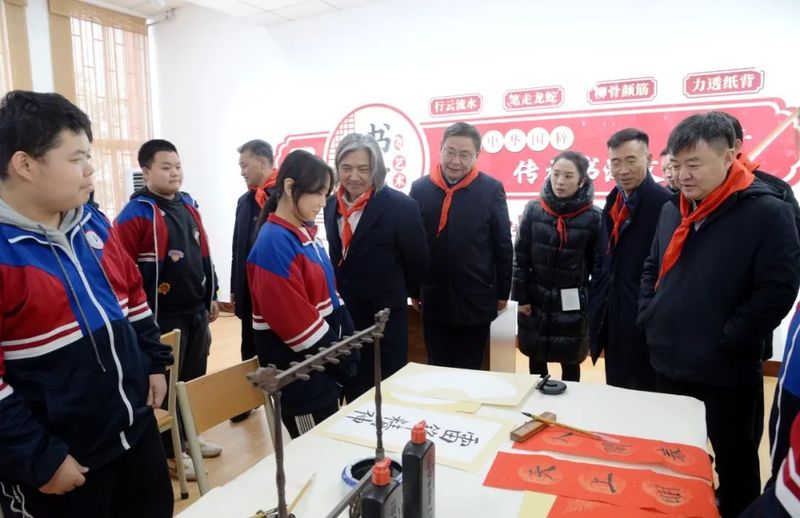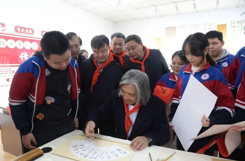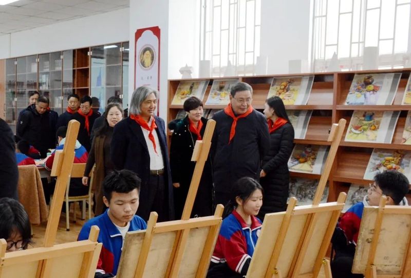 艺华厅活动结束,吴为山一行来到位于藏慧楼一楼的美术功能教室,实地调研学校美育工作,并指导师生书法、美术教学。